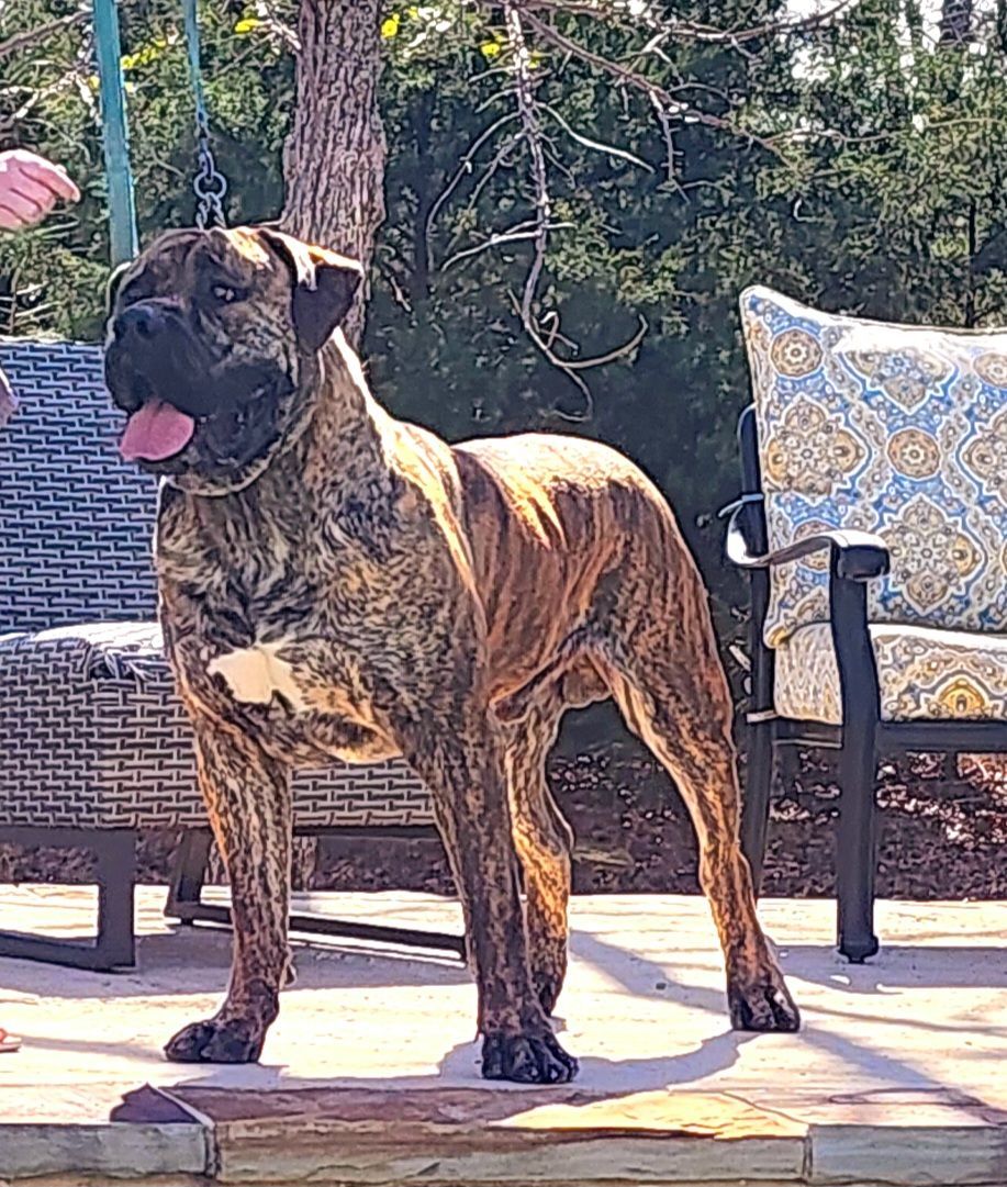 Arrow is a stunning dog. He has a fabulous top line and structure with a showstopping ultra brindle coat. He is playful and fun. He was an outsource breeding. I had always admired his father and his temperament and was excited to include him in my program.
