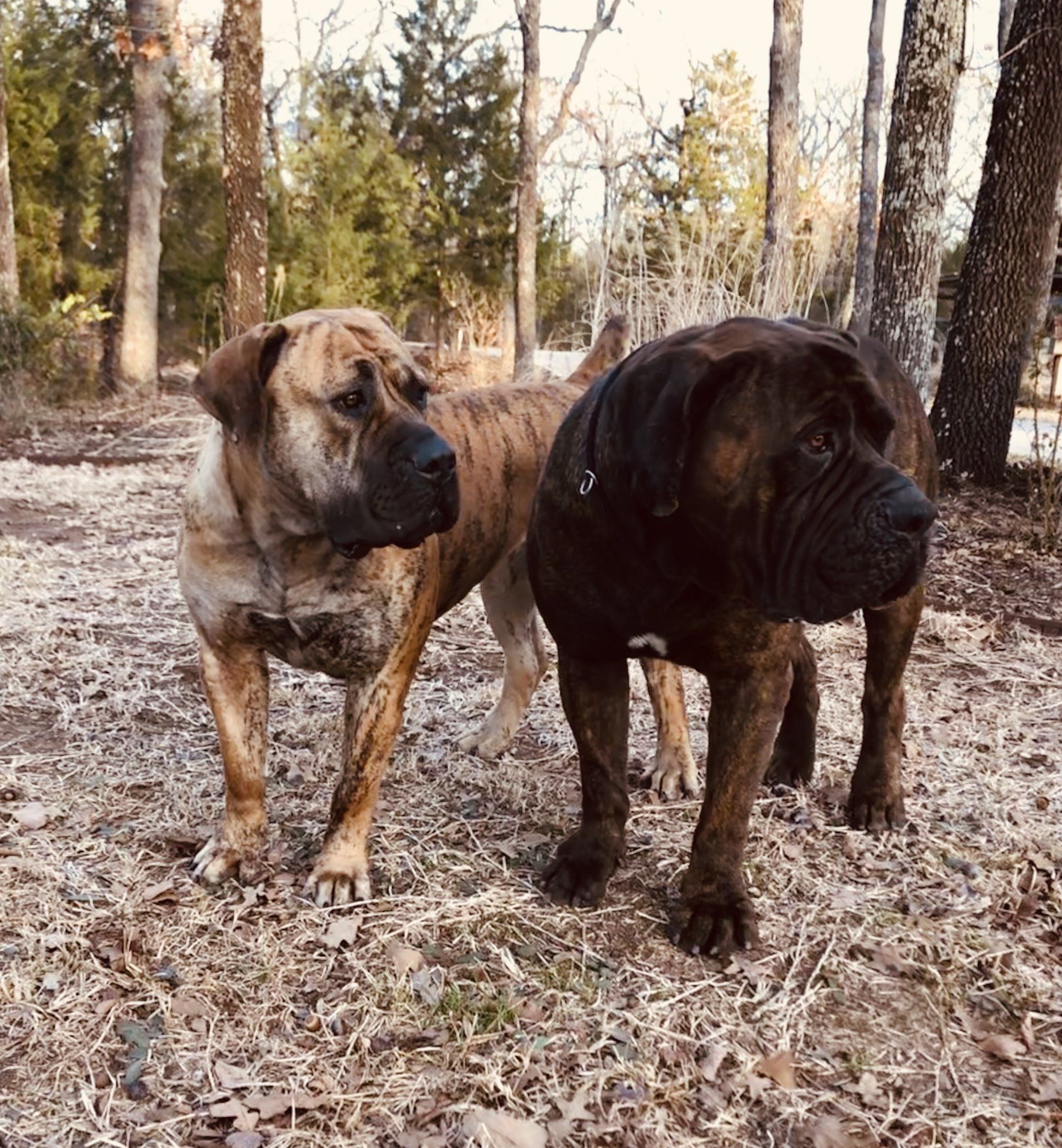 Located East of Dallas, in Royse City, Texas. We own 10 wooded acres where our dogs run. We rescued a Boerboel over 16 years ago and fell in love with the breed. Known for their incredible loyalty, protectiveness, and strength our first boy Leo demonstrated all of those traits. Later we purchased another and raised them as part of our family. Eventually we had five Boerboels running around. When the last one died of old age a few years ago we lasted a week before starting the search for another. We decided to import several of our dogs directly from South Africa. We spent months looking over pedigrees and trying to put together a long range plan for our program. We wanted to offer a diverse selection of pedigrees including some of the old time greats.