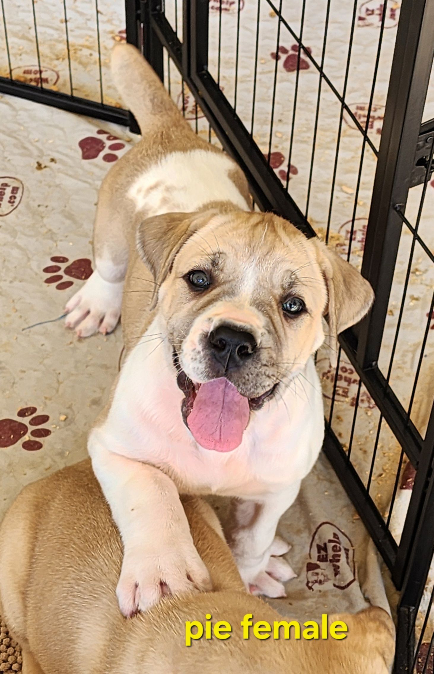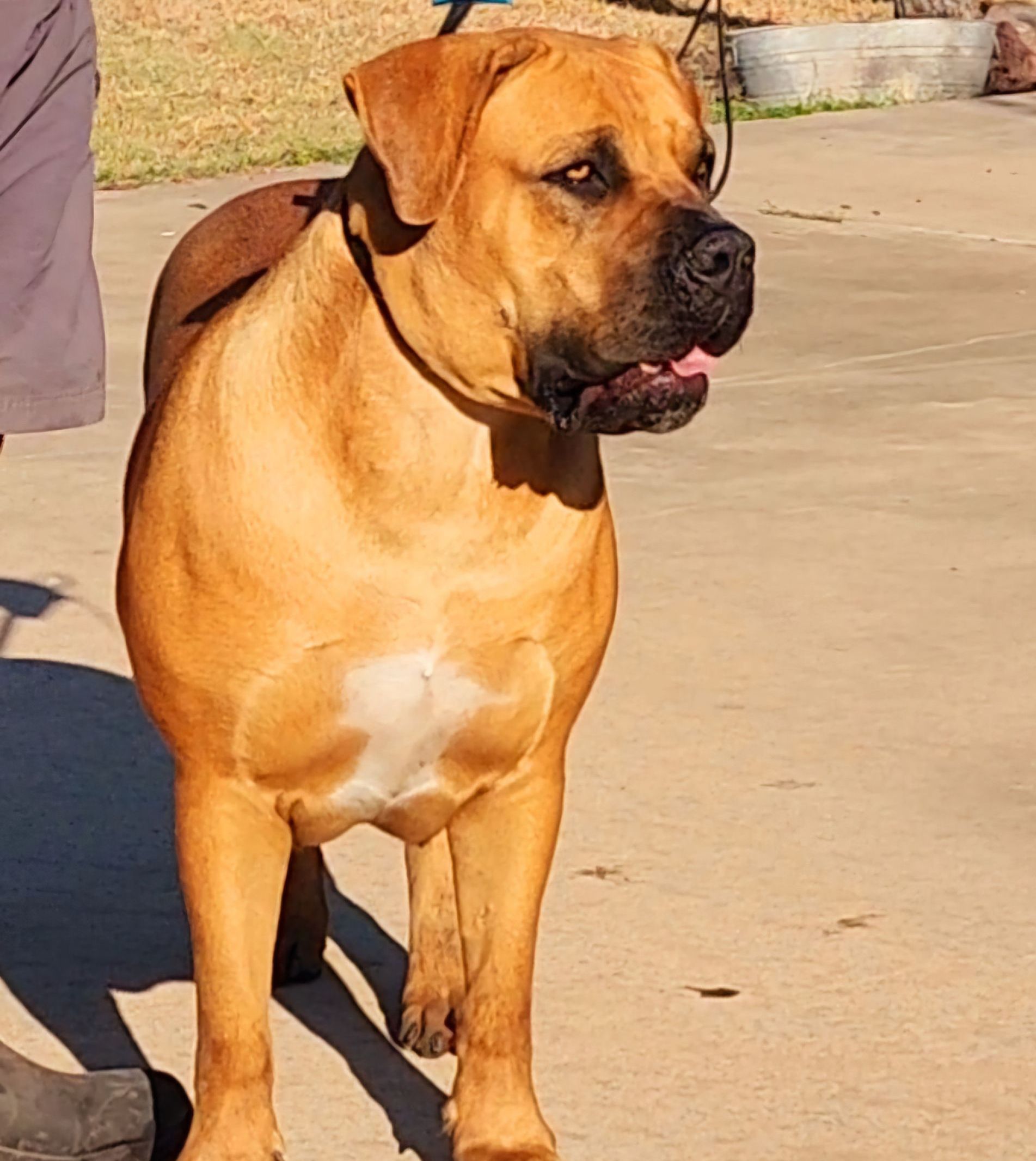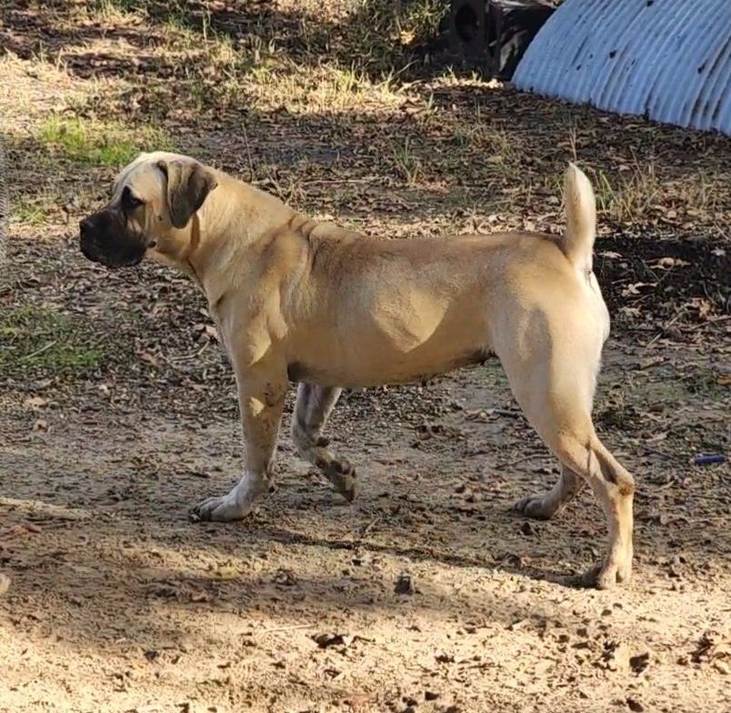 Tinkerbella is a fun girl. She is playful, energetic, and loves her attention. She had done a great job in the AKC show ring and is almost an AKC Champion. She has a stocky frame with lots of bone and muscle. Tink loves kids and loves to play.