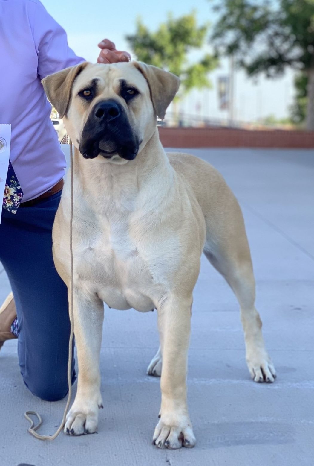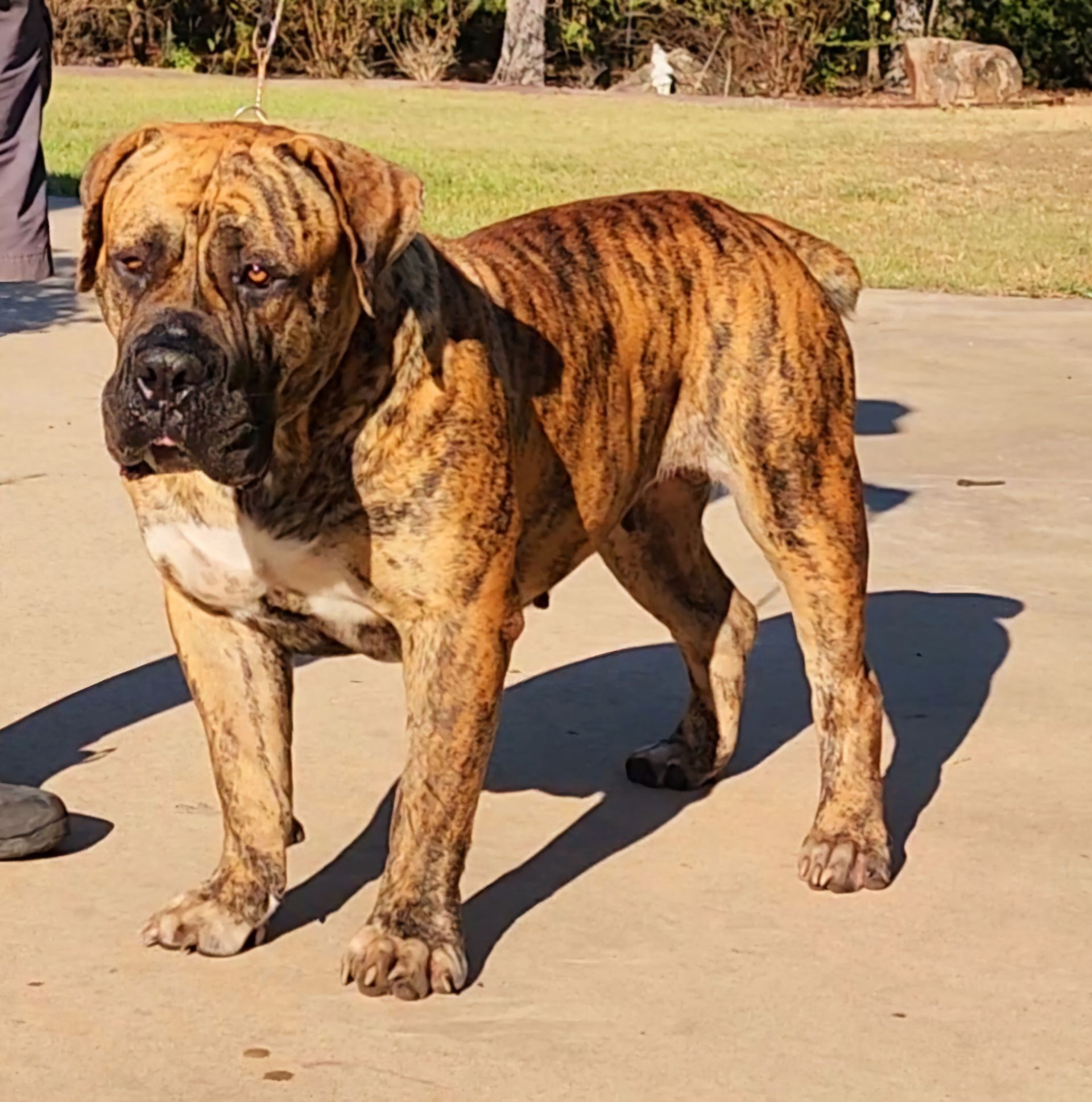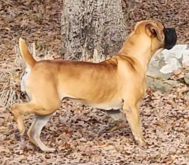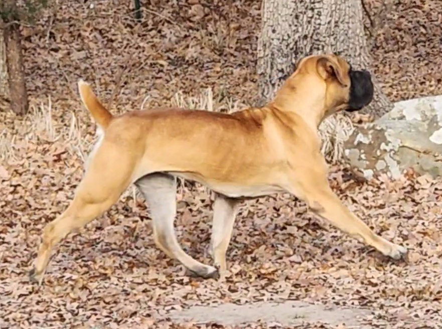 Julep has an amazing pedigree! Her grandfather is the one and only Bellbusk Jeep. This pedigree brings a lot of wonderful bloodlines to our program and we are excited to add the diversity. Julep is a sweet and confident girl. She loves to play and loves kids. She is happy and outgoing. At only nine months she took a 4 point major win at her first AKC dog show. She is compact, with a short muzzle, amazing reverse brindle, and a full mask. We are excited to watch this girl develop.