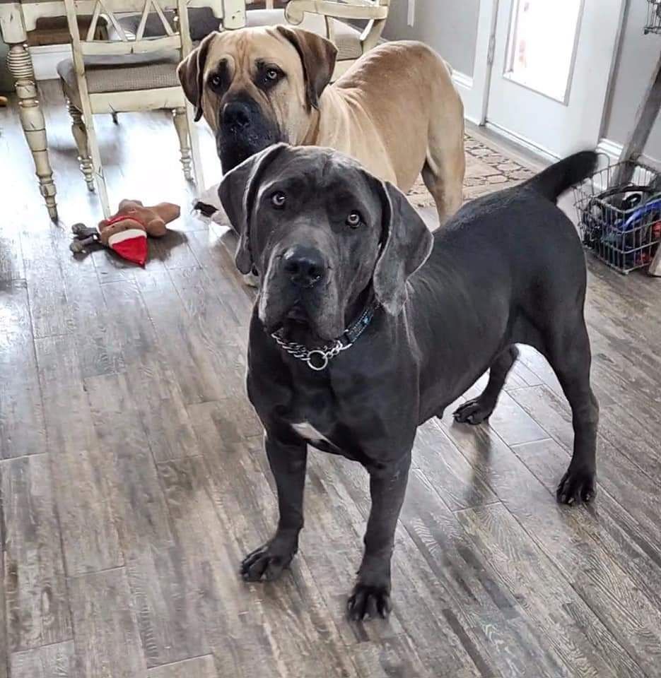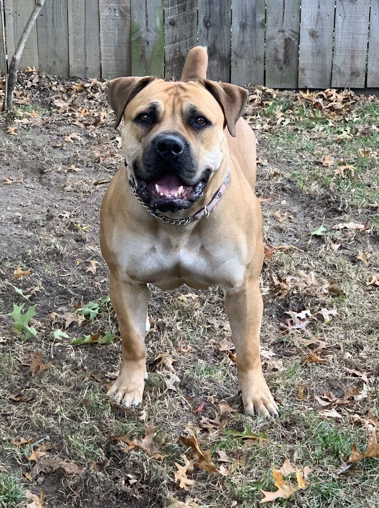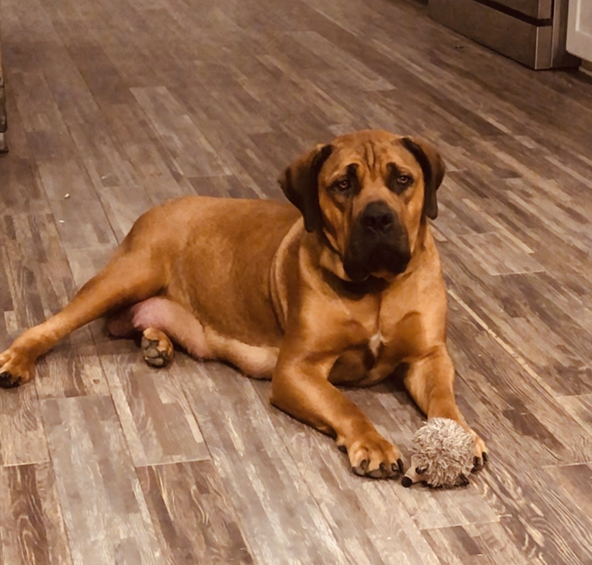 Jinxx is a dilute black or blue Boerboel. I imported her aunt, and she was my heart dog. We lost her unexpectedly and the same week found out her brother had a litter of pups here in the US. Jinxx is so much like her aunt. Loves attention and affection, incredibly playful, and adores water. It is almost impossible to keep her out of the water dish which creates mud in her yard which she loves to play in. She is active and energetic but becomes a ball of mush when you pet her cheeks. I cannot wait to see what she produces!