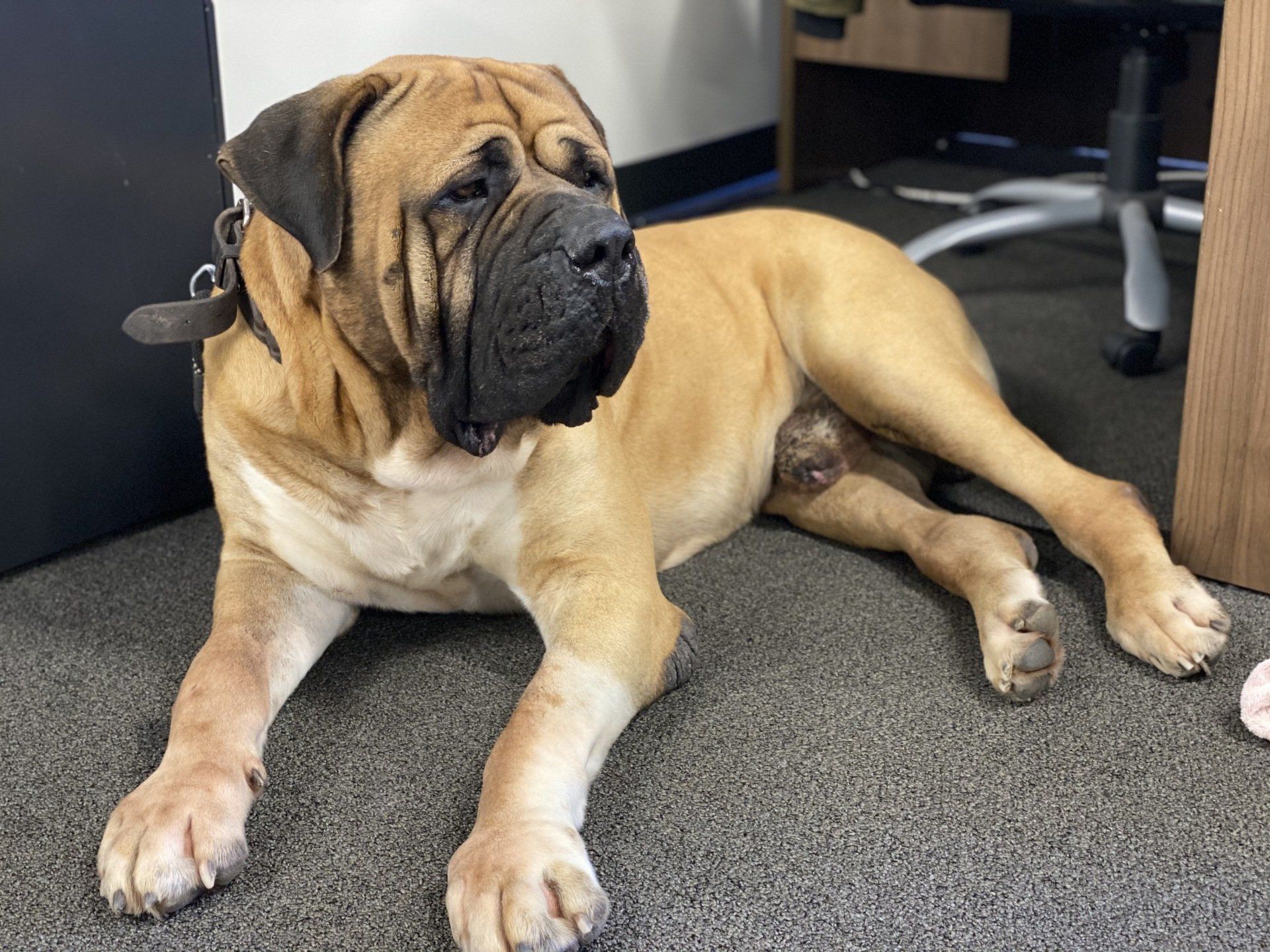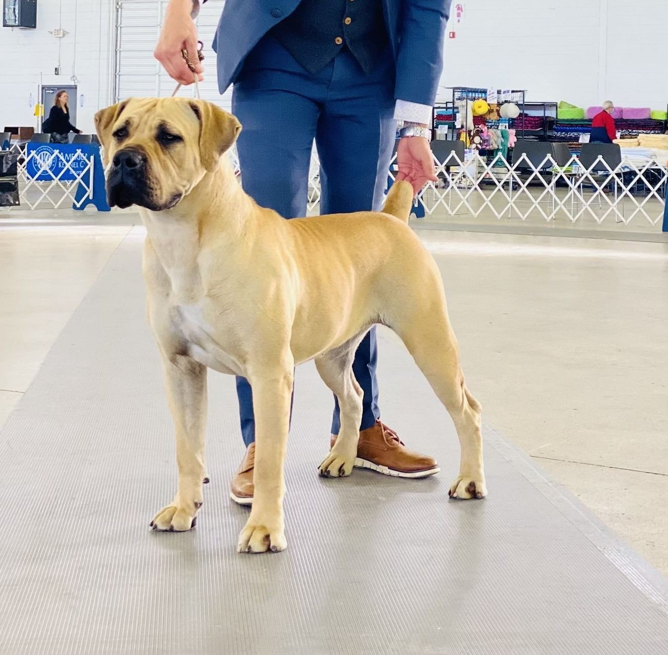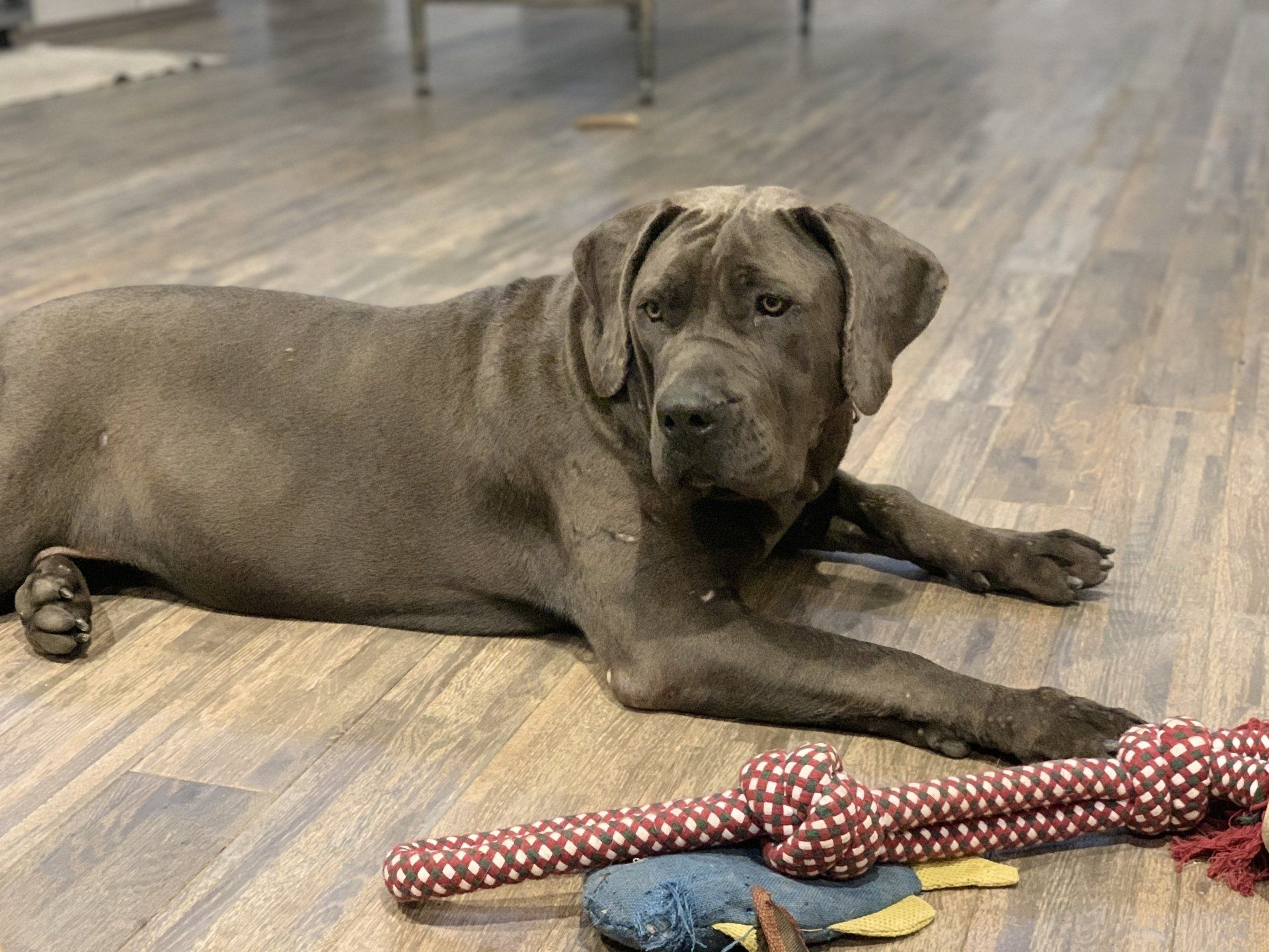 Jinxx is a dilute black or blue Boerboel. I imported her aunt, and she was my heart dog. We lost her unexpectedly and the same week found out her brother had a litter of pups here in the US. Jinxx is so much like her aunt. Loves attention and affection, incredibly playful, and adores water. It is almost impossible to keep her out of the water dish which creates mud in her yard which she loves to play in. She is active and energetic but becomes a ball of mush when you pet her cheeks. I cannot wait to see what she produces!