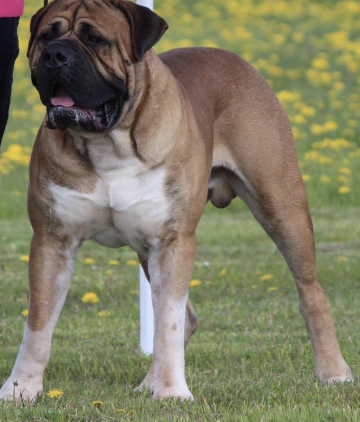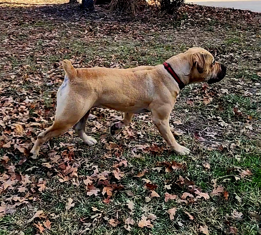 Elevation Lady in Red or Pumpkin as we call her is the sweetest dog! She was a great mother, loves kids, is loyal and obedient. Unless you don't want her to sleep on the couch and then she is naughty in the middle of the night. She has proven to have a strong protective temperament and closely guards the ones she loves. Pumpkin is a true South African Boerboel, she has a thick compact body. Her line will continue in our program through Leontix Scars Make us Beautiful aka Frankie.