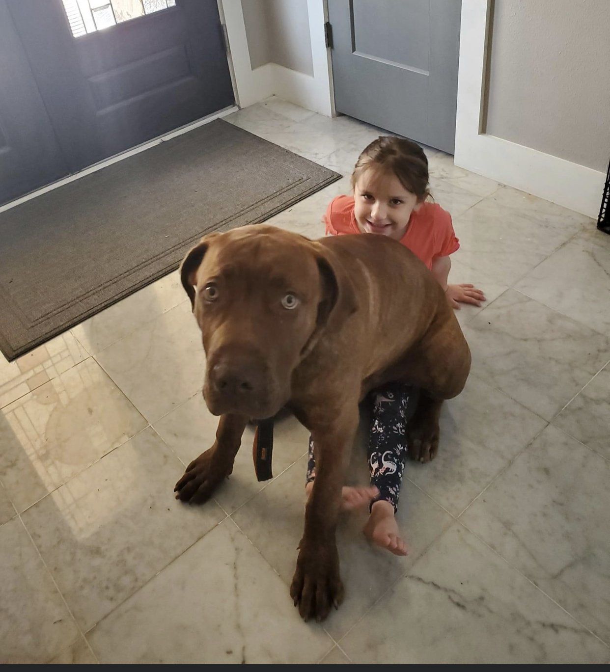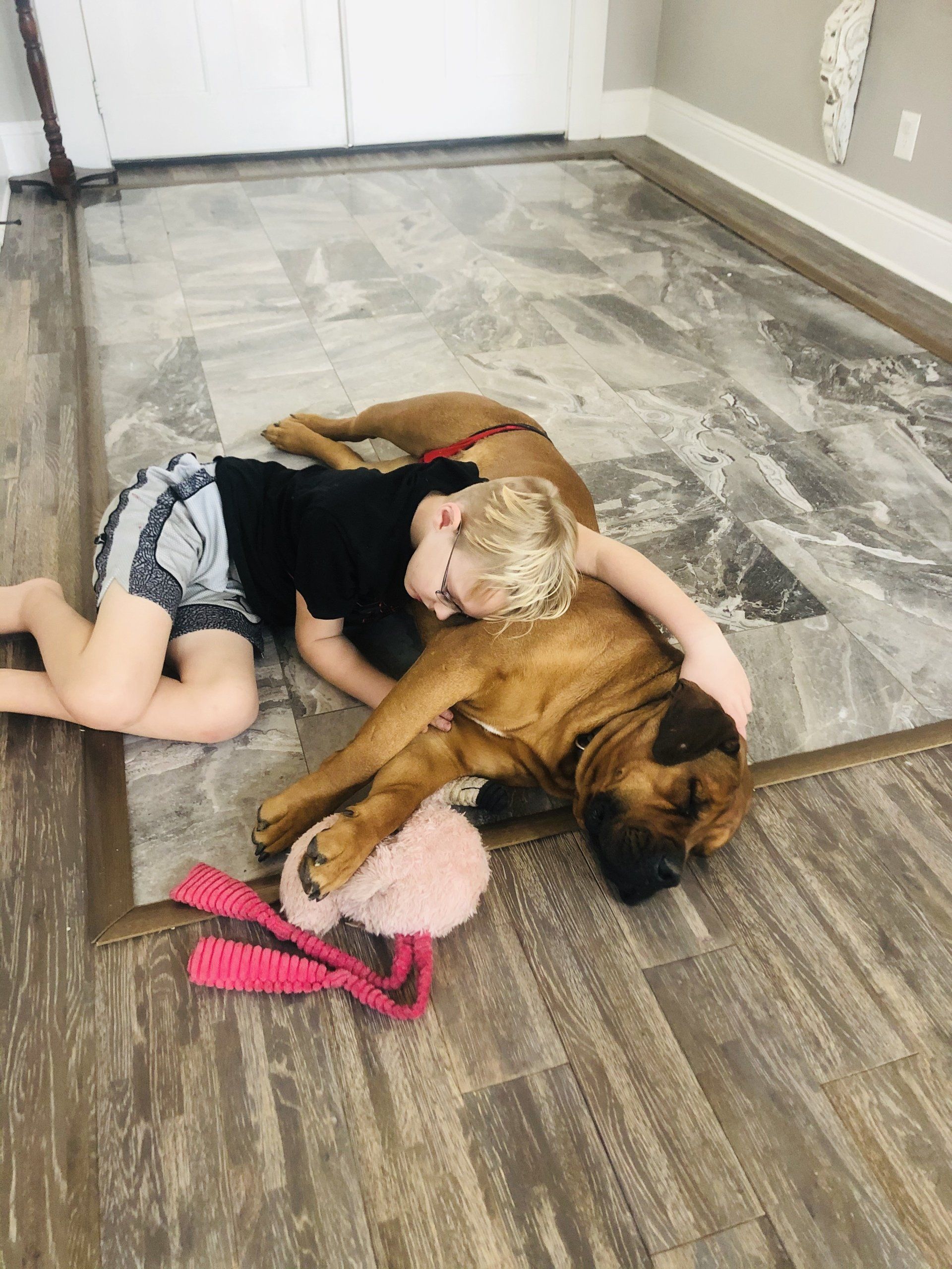 I recently had to put my Boerboel down due to cancer, he was 10 1/2 and my best friend. My original breeder no longer was breeding anumore so I started researching Boerboel breeders. I came across Natalee with Texas Leontix and from the beginning I knew she was our new breeder. How did I know, well when your standing in a yard full of grown Boerboels, 1 of each color I might add, I realized I was standing in the middle of over a thousand pounds of dogs and it was so calm I felt like Ace Ventura. But I had done nothing to achieve this but Natalee had. It was an experience I will never forget. I filled out the questionnaire and I put down my deposit and patiently waited for the puppies to come. I had certain requests, male, red, and docile.